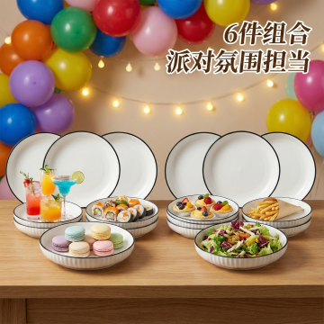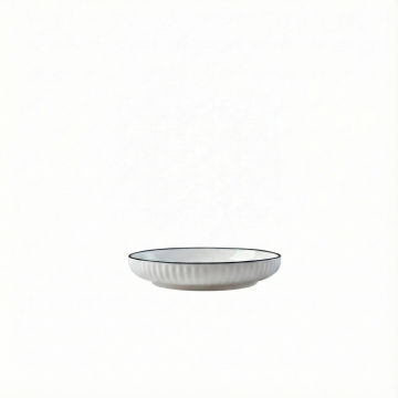 简约现代风格,纯白纯色背景,中央规整排布单一元素图案——一个白色陶瓷盘子,盘子造型可改变(如圆形、方形、椭圆形、花瓣形等),适当增加简约几何纹样或线条纹理,陶瓷材质光滑细腻,边缘圆润,具有柔和的高光和自然阴影,整体构图简洁干净,无任何文字、logo和水印,画面纯净素雅。