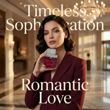 为这款100ml香水,生成4张宣传海报,含人像展示图,卖点集合图(卖点列表展示),场景使用图,香调图,调性图,图片尺寸比例1:1,高级调性,符合欧美审美,海报上的文案是英文,不能有中文,贴合产品卖点,卖点参考以下:1. 客群卖点 精准适配25-35 岁 “轻熟精致派” 女士:包括职场高阶白领(需要 “有质感不张扬” 的香调撑气质)、偏爱 “仪式感包装 + 层次香” 的精致收藏党(瓶身自带装饰 / 送礼属性)、追求 “淡甜不幼稚 + 有气场” 的社交型女生(拒绝少女感甜腻,要柔雅中带沉稳)。 2. 香味卖点 前调 “清润凉甜,中和气场”:柚子的鲜爽裹着冰荔枝的凉甜,像 “冰镇鲜果饮” 的清润感,消解了成熟瓶身的厚重感,开场不压人; 中调 “柔雅淡甜,轻熟柔媚”:木兰的优雅 + 莲花的清雅 + 石榴的淡甜,是 “裹了层柔光的初夏花簇”,温柔却不幼稚,适配轻熟女的气质; 后调 “暖润沉稳,锁香有质感”:琥珀的暖感叠上桃花心木的木质沉稳,让香调从 “清润” 落向 “有厚度的柔雅”,留香时自带 “淡而有分量” 的记忆点,避免清新香的 “飘”。 3. 外观卖点 酒红水晶 + 金属箱型,自带高级仪式感:酒红透亮瓶身 + 银色金属箱式设计(锁扣、铆钉细节),像迷你奢华行李箱,摆化妆台是质感装饰,拿在手里补香自带气场; 小巧便携不占地:6.3cm×5.3cm×9cm 的尺寸,100ml 容量却能轻松塞进随身包,通勤 / 出行补香都方便。 4. 调性卖点 “清润优雅的轻熟气质香”:既没有少女香的甜腻幼稚,也没有熟龄香的厚重沉闷,是 “清润开场→柔雅过渡→沉稳收尾” 的层次里,藏着轻熟女的 “柔而有气场”。 5. 适用场景卖点 职场通勤 / 商务洽谈:淡香不扰人,香调 + 瓶身双重衬出专业精致感; 晚宴 / 轻社交场合:酒红瓶身撑气场,香调的柔雅感拉近距离,不抢戏却添格调; 约会 / 纪念日:柔媚香调衬出温柔,仪式感瓶身显用心,是 “氛围 + 质感” 双加分项; 短途出行:小巧尺寸便携,香调适配各种外出场景。