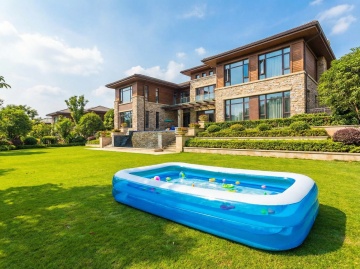 一座现代风格的高档酒店建筑,在黄昏时分的蓝色天空下,建筑顶部和底部有温暖的黄色灯光勾勒轮廓,酒店前方有一片平静的水面,清晰地倒映出建筑的灯光和轮廓,周围有绿树环绕,建筑底层有带遮阳伞的户外休息区,整体呈现出宁静、奢华、大气的氛围,建筑细节丰富,玻璃幕墙反射着天空的颜色,光影层次分明,画面构图平衡,具有强烈的视觉美感和高级感。