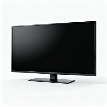 一个超高清的现代平板电视产品展示图,采用极简主义3D渲染风格,纯黑色哑光屏幕与光滑的黑色边框无缝衔接,屏幕右侧有一道柔和的高光斜切过渡,展现出细腻的玻璃质感和金属边框的精致光泽,底部配备纤细的黑色金属支架,整体悬浮于纯白色背景之上,光线均匀柔和,突出电视的超薄机身和优雅的几何线条,营造出高端、科技感与简约美学兼具的氛围,无任何文字或标识干扰主体展示。