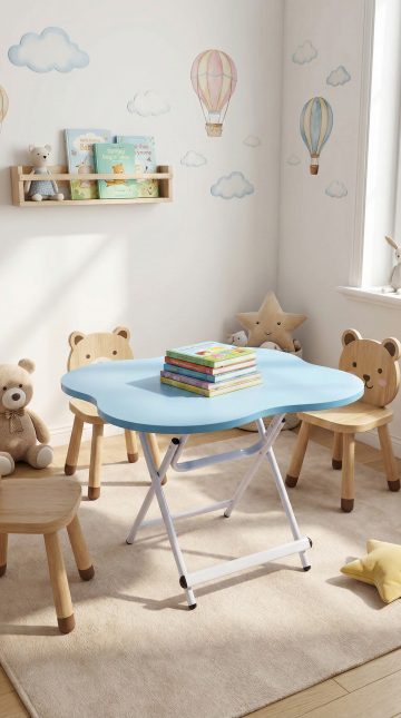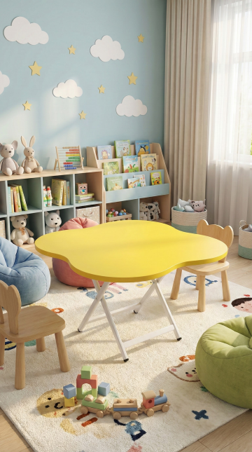 3D渲染风格的书桌场景,浅木色桌面搭配蓝色储物柜与橙色椅子,色彩明快和谐,柔和自然光从侧面照射,形成清晰柔和的光影层次,储物柜上层放置叠放的书籍,桌面右侧有黄色方形笔筒内含彩色铅笔,整体构图简洁有序,营造出明亮、整洁、温馨的居家办公或学习氛围,不同场景可替换储物柜内物品、桌面文具摆放及背景墙装饰,保持相同的现代简约风格与色彩搭配逻辑。