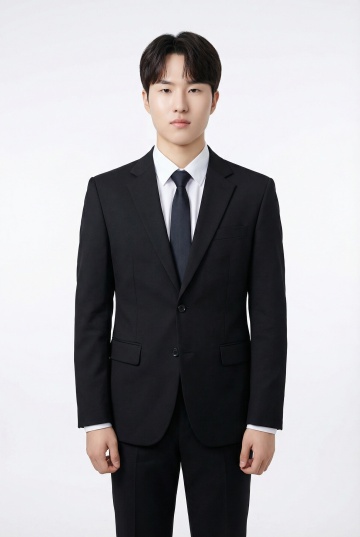 一位年轻亚洲男性,身着剪裁合体的黑色西装,内搭白色衬衫,系着黑色领带,左手自然插在西装裤口袋,右手轻握西装前襟,面带温和微笑,姿态自信挺拔,背景为纯白色,整体呈现清晰、专业、正式的商业人像摄影风格,光线均匀柔和,突出西装的挺括质感与人物的精神面貌。