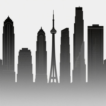 极简风格城市天际线剪影,采用黑白灰三色渐变层次表现建筑立体感,垂直构图展现高楼密集排列的都市风貌,建筑轮廓线条硬朗简洁,通过不同高度和形状的几何块面组合形成错落有致的韵律感,光影处理为从下至上的深灰到浅灰渐变,营造出夜晚城市剪影的静谧氛围,整体设计具有强烈的现代感和抽象表现力。