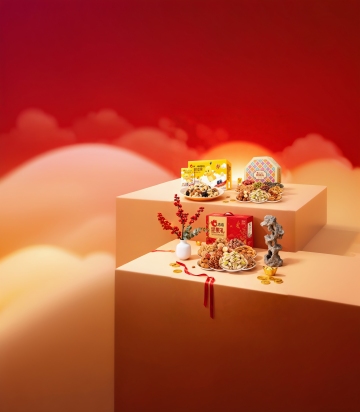 特写镜头,在一幅展开的古卷式背景上,精致的六角形红木礼盒静静置于青玉案几中央,盒面以螺钿工艺镶嵌出寒梅傲雪图,金线勾勒的"中秋月礼"四字印章庄重典雅。礼盒左侧斜倚着一柄象牙白瓷茶壶,壶嘴袅袅升起几缕金色茶雾,右侧铺展着三张酥皮月饼:一枚蟹壳黄的火腿五仁饼上撒着芝麻,一枚流心奶黄饼微微裂开露出琥珀色内馅,最前方的莲蓉双黄饼旁斜插着一支丹桂。背景是水墨渲染的远山与一轮朦胧圆月,案几边缘垂落着半透明的玉色流苏,空气中浮动着细小的桂花金粉。海报上方"月满人间·饼承心意"八个篆字采用烫金立体字,下方"苏式鲜肉 × 广式莲蓉 × 新式流心"的产品说明旁点缀着三枚迷你月饼剪影,整体色调以紫檀木色为底,搭配月白、蟹壳黄与桂花金,营造出雅致庄重的中秋礼赠氛围。