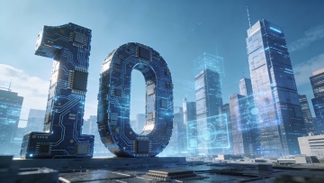 等轴视角的 3D 数字孪生工业场景,画面中心是一台未来感的电脑主机/控制中枢,显示悬浮的 AI 算法代码界面和数据云标识;周围环绕多个象征业务领域的 3D 模块:机械臂+输送平台(代表智能制造)、履带式特种机器人+水池反应堆模块(核电与异物检测)、医疗十字与手术监护界面模块(智慧医疗)、城市建筑+管道检测模块(城市排水识别)、摄像机/传感器模块(AI感知)。所有模块通过发光的数据线连接,构成信息中