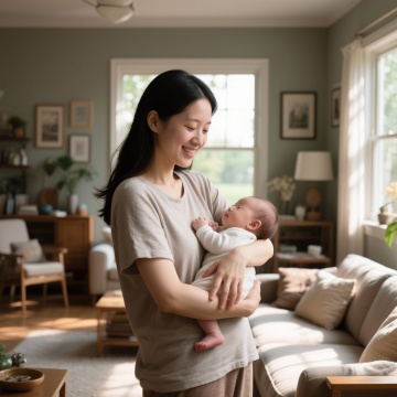 一位穿着白色吊带连衣裙的长发女子斜倚在柔软的米色沙发上,双手高高举起一个穿着白色连体衣的婴儿,婴儿悬空舒展着四肢,两人脸上洋溢着幸福灿烂的笑容。温暖柔和的自然光从窗外洒落,透过轻盈的白色纱帘形成朦胧的光影效果,照亮了整个室内空间。整体画面呈现出温馨、治愈的氛围,采用写实的摄影风格,色彩以柔和的米白色调为主,光影过渡自然,细节清晰,捕捉到母子间亲密互动的美好瞬间。