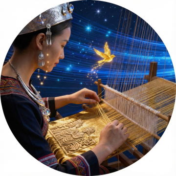 生成一个女人要做扎染,首先是准备染料的图片准备染料(侧俯视角)身着白族扎染服饰的女子半蹲于木案前,一手扶着靛蓝染料碗,一手持木勺搅拌,发丝垂落肩头,衣袂垂地,线条简约勾勒出手臂的弯曲弧度与服饰的盘扣纹样。画风古风自然,线描,不要写实,颜色不要多,除了肤色和头发,其他都呈现蓝白渐变色,不要过多颜色,不要背景,全景,不要半截脚这种
