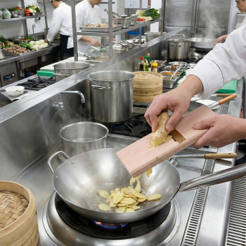 请画一副制作红烧鱼的场景,正在往锅中烹料酒,写真图片