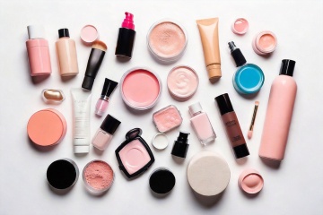 一套6个美妆产品插画,保持扁平风格,纯色背景,每个插画都有不同的美妆元素:1.粉色面霜罐配白色盖子和金色装饰;2.透明玻璃瓶身的爽肤水,带银色喷头;3.绿色管状乳液,白色盖子;4.粉色化妆包,带金色拉链和花朵图案;5.一套3支化妆刷,白色手柄和粉色刷毛;6.红色唇膏,金色盖子。每个元素都有简洁的线条,明亮的色彩,圆角设计,轻微的立体阴影,整体风格统一,适合作为系列素材集合规整排布。