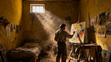 黎明微光中的古老修道院侧门,厚重的橡木双扉上嵌着六边形铅条玻璃,历经岁月的铜制门环与十字形锁具在晨露中泛着冷光,门楣上雕刻着模糊的拉丁文祷文。两侧是青苔斑驳的灰色石墙,顶部爬满干枯的常春藤,地面由不规则的青石板铺就并散落着昨夜的枯枝败叶,晨雾从门缝中渗出,将第一缕金色阳光折射成细碎的光斑,构图采用低角度仰拍强化门的庄严感,整体色调为青灰底色上点缀着暖金晨光,营造出神秘而肃穆的时空交界氛围。