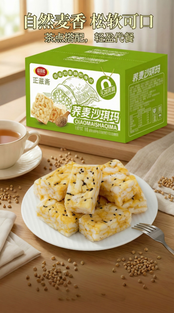 参考图片,图片文字内容不变。背景要有荞麦成堆散落,图案有零添加蔗糖,文字要有拍一发四,,图片尽量靠上,主题荞麦沙琪玛