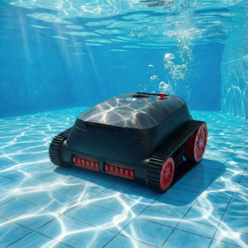 赛博朋克风3D渲染,未来感十足的摄像机置于金属基座,霓虹红光交织,光影与体积感强烈,科技酷炫氛围扑面而来。