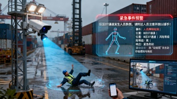 码头前沿,几个固定式高清AI摄像机正对着作业区域。其中一个摄像头的视野内,一名工人未佩戴安全帽进入作业区,其身影被红色轮廓线标出,对应室内的其中一块分屏立刻弹出该人员的放大画面与违规提示。另一块屏幕上,则以动态热力图的形式显示着整个港口的实时人流与车辆密度分布。