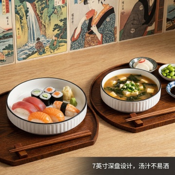这是一只陶瓷盘,其名称为山田竖纹圆盘,碗口直径为7英寸。我给你提供了一张白底图,请根据我的白底图,帮我绘制20张不同角度的场景图。每张场景图比例为1:1,内容是将这些盘子与不同的日常生活场景结合,并配上简要的卖点介绍。特别注意生成的场景图中,必须包括2个、4个或者6个这样的盘子。每个盘的造型、颜色或者样式都不能改变,必须和我提供的图片中的盘子一样。盘的大小、摆放角度、位置可以根据场景的不同进行调整。