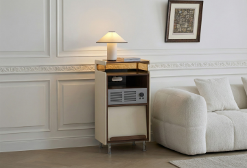 暖光轻雾萦绕,木雕风床头柜上简约加湿器静置,柔光透帘,营造冬日温馨实景感,轻拟物设计呼应自然舒适。