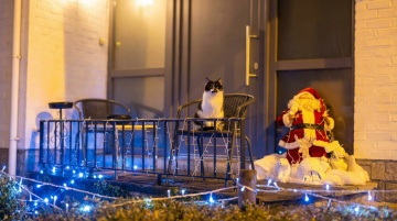 以参考图为内容,确保不改变建筑及轮廓的前提下,生成趣味的圣诞节包装,建筑戴着红色的圣诞帽,包裹着绿色的毛线,毛线上有白色雪花、红色圣诞袜图案,建筑底部还围着一圈金色的圣诞花环,地面积雪,营造温馨的圣诞氛围,强化圣诞氛围,树上和建筑上增加圣诞节的氛围灯,亮黄色暖调,画面氛围:活力、欢快、愉悦、美好,比例 ,比例 「16:9」为我生成两张图像