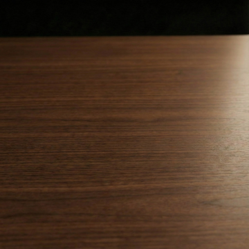 一张木桌的特写镜头,采用极简主义摄影风格,暖色调光线从左侧斜射,在深棕色木纹桌面上形成柔和的光影渐变,桌面边缘可见一本翻开的白色笔记本,右上角有一小株绿色植物的局部枝叶,背景模糊处理,突出木质纹理的细腻质感和简洁宁静的氛围。