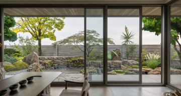 现代日式风格庭院设计,明亮通透的室内外空间融合,中央区域摆放浅色木质长椅与圆形小茶几,搭配白色坐垫,左侧有高大绿植与小型灌木组合,地面铺设浅色大块石板,阳光透过树叶在地面形成斑驳光影,右侧玻璃推拉门映出室内景象,整体色调以白色、浅木色与绿色为主,营造宁静自然、简约舒适的氛围,光影层次丰富,空间布局开阔有序,充满禅意与现代生活美学。