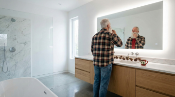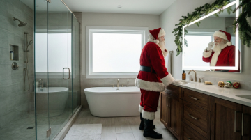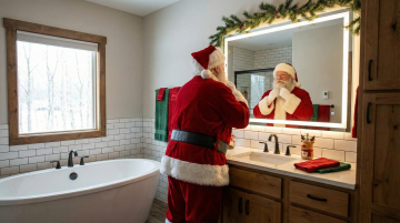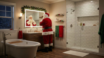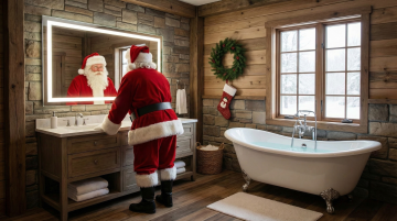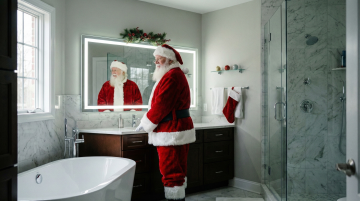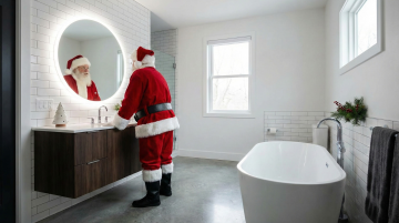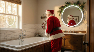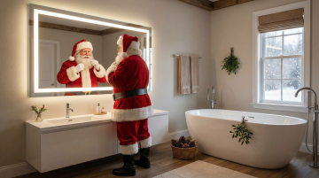 比例 「16:9」美国浴室场景,LED灯镜,浴池,圣诞老人在照镜子,穿着圣诞服装,少加一点圣诞元素,现代简约风格,美式风格,四张图,高清,4k