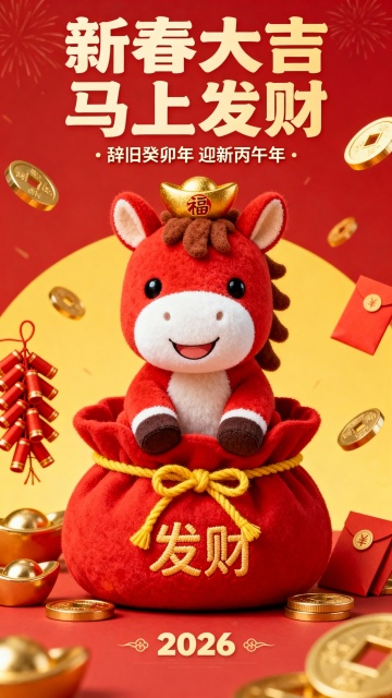 软3D风格萌马坐于刺绣风“发财”钱袋中,搭配金元宝、红包与鞭炮,喜庆卡通感十足,传递2026丙午年新春吉祥财运。