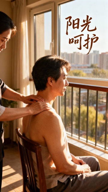 温暖柔和的自然光透过竹帘洒入,营造出宁静舒适的氛围。一位专业的按摩师正手持白色陶瓷小壶,将金黄色的按摩精油缓缓滴落在顾客的背部。顾客趴在铺着洁白毛巾的按摩床上,背部肌肤在阳光下泛着健康的光泽。背景是简约雅致的木质装饰和绿色植物,整体环境充满自然、放松的感觉,光线柔和温暖,突出精油滴落的瞬间和肌肤的质感,营造出高端SPA的舒适体验。