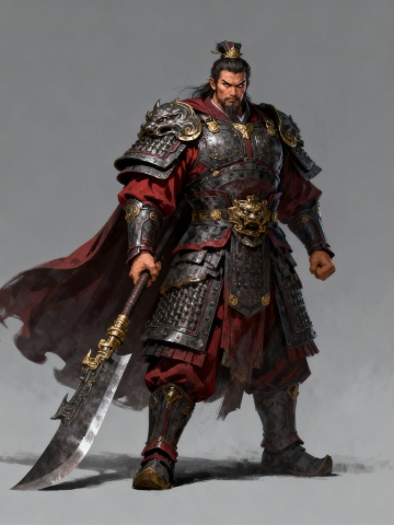 中式古典风,3D重拟物渲染,鎏金铠甲与龙纹大刀彰显热血与严峻,油画质感增强故事氛围,体积感十足的战将立于古战场,尽显英雄气概。