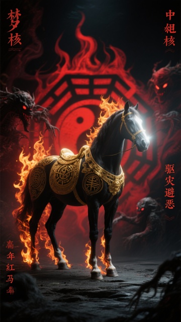 国潮风3D重拟物设计,鎏金铠甲骏马踏火而立,火焰环绕,阴阳八卦背景烘托神秘神圣感,金属质感与光影交织,超现实主义呈现驱灾避恶的中式神话意境。