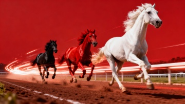 鎏金骏马踏云而行,水墨山水为幕,红云缭绕,国潮风韵中融古典与梦幻,展现东方奢华之美。