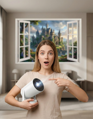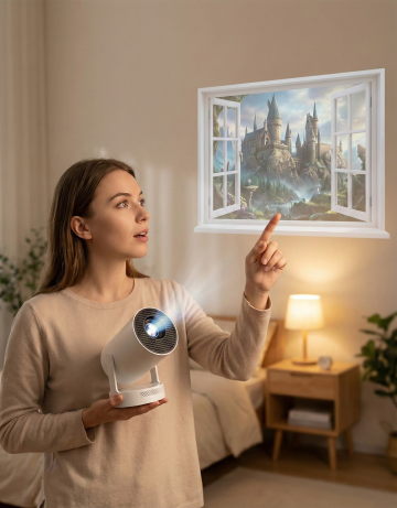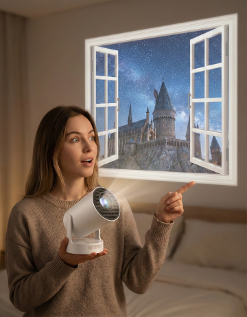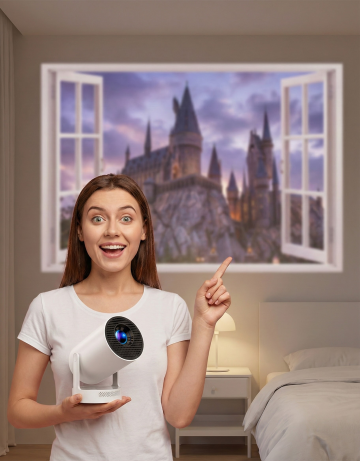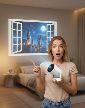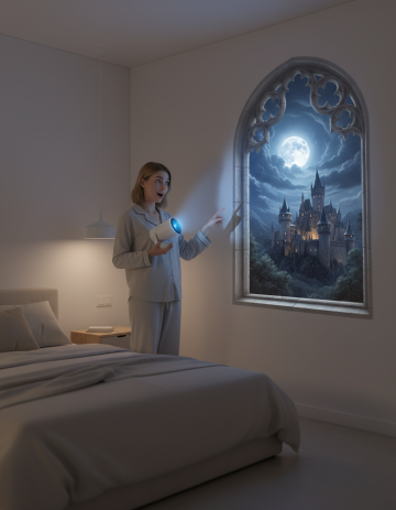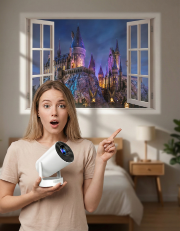 这是一个迷你投影仪,帮我生成一张图片:一个简洁的卧室中,一个欧美年轻女性惊奇的表情,一只手将该迷你投影仪托在胸前,另一只手伸出食指向后面的墙上指着,墙上是投影仪投射的栩栩如生的假窗户场景(美国现在tk挺火的那个投影仪窗户),窗外是古城堡的奇幻场景。至于其他的可以帮我稍微丰富一下,但不能出现其他的产品。景深加大