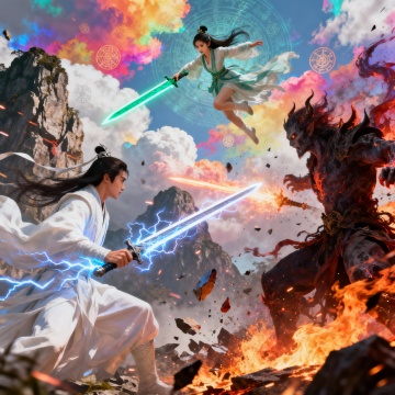 梦幻古典中式插画,仙人御剑飞行,云海缭绕,水墨风格渲染虚拟现实。