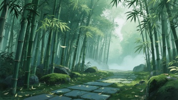 中式古典建筑,竹林环绕,清新雅致,插画风与水墨风结合,营造宁静氛围。