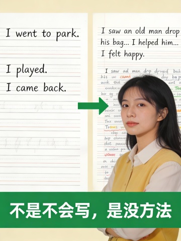 1:1 教育成果展示图,小红书风格。 左右分屏对比: 左侧:“第1周作文” → 卡通纸张上写“I play games. It is fun.”(打叉) 右侧:“第4周作文” → 同样纸张写“First, I helped mom... Because...”(打勾+星星) 中间:大箭头从左到右,标注“4周改变”。 底部:三句家长感言气泡:“他主动划原文了!”“作文有了逻辑!”“阅读全对!” 配色:左侧灰暗,右侧明亮,突出进步感。