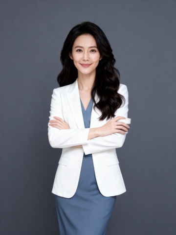 知性白色西装蓝裙双手抱胸女士形象照
