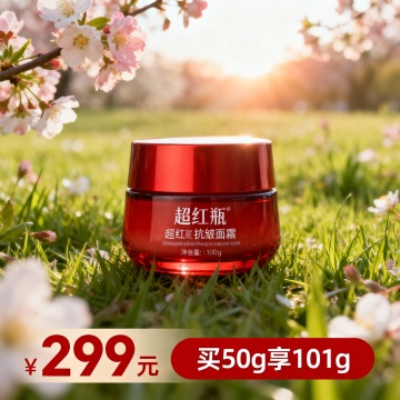 现代感玻璃瓶身搭配柔和光影,轻拟物风呈现面霜质感,浮雕式文字增强视觉层次,实景拍摄传递舒适体验,节日礼赠首选。