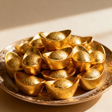 3D国潮风设计,鎏金金属质感钱币与红包满溢,重拟物风格呈现喜庆春节氛围,象征财富与祝福。