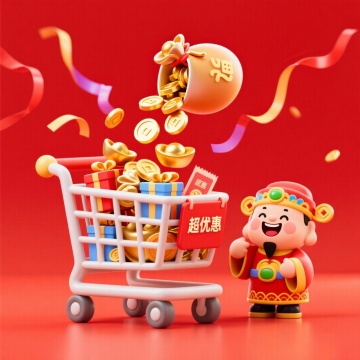 3D微缩艺术风格,国潮风与鎏金元素融合,购物车满载金币礼盒,福袋倾泻而下,喜庆感十足,传递新春超优惠节日氛围。