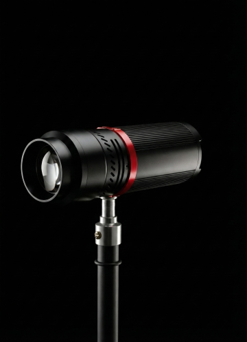 极简风格的射灯设计插图,单个筒状射灯安装在深灰色背景的顶部中央,发出强烈的白色锥形光束,光线明亮且边缘柔和,光束从顶部向下呈放射状均匀扩散,照亮下方区域,背景为纯深灰色渐变,无其他装饰元素,整体营造出简洁、专业、聚焦的氛围,光影对比鲜明,射灯形态简约现代,突出其照明功能和工业设计感。