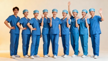 明亮洁净的医院走廊背景,柔和的自然光从侧面窗户洒入,光线均匀柔和,营造出专业、可靠且充满希望的氛围。画面中几位身着白色医生服的医护人员,胸前佩戴听诊器,双臂交叉站立,姿态自信而沉稳。前景人物清晰聚焦,背景人物逐渐虚化,形成自然的景深效果。整体色调以纯净的白色为主,搭配医护人员制服的蓝色细节,色彩明亮、干净、和谐,具有高度的写实感和专业医疗行业的视觉特征。
