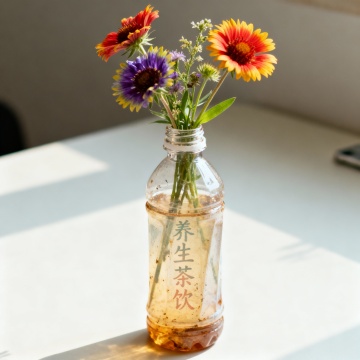 微距摄影,清晨阳光中,玻璃杯里葛花在水中舒展,杯壁凝结水珠,旁边放着一小罐蜂蜜和勺子,画面干净清新。3:4