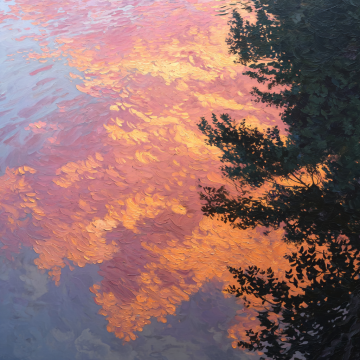 一幅印象派风格的油画,描绘了宁静的湖面倒映着日落时分绚烂的橙红色光芒,水面波光粼粼,笔触厚重而富有质感,前景有深色的芦苇剪影,天空呈现出从深蓝到橙黄的渐变色彩,整体氛围温暖而祥和,光影对比强烈,色彩浓郁,画面充满了诗意的美感。