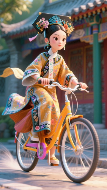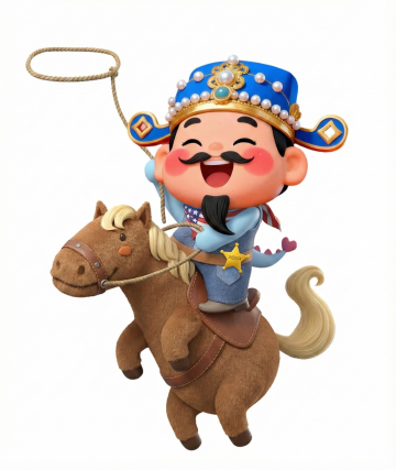 一匹黑身白蹄的卡通骏马歪脖子向镜头做凶悍表情(瞪眼,怒眉,鼻孔撑大,咬牙,嘴夸张的歪向镜头,颈部系缀绿宝石、挂金色铃铛的华丽项圈,鞍具覆青绿底配金黄、红色缠枝纹的装饰垫)、极度夸张胖的Q版乌骓马(矮,墩实,壮),马腿细短(半截白色),Q版,马歪脖子看镜头,身形圆润的武将骑着马(留浓密黑髯,宽胖脸颊,面部神态威严,身着绿底配金黄、红色纹饰的传统武将服,服饰带中式缠枝纹刺绣,袖圈、腰带饰有金色纹样,头戴嵌宝石的乌纱帽),汉代审美,C4D建模,blender渲染,细节刻画,玩偶,模糊的场景设定为中式红墙、地面为石砖纹理;