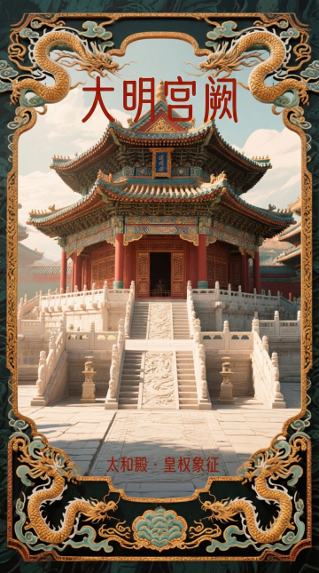 鎏金飞檐映蓝天,重拟物风展现中式古典庄严,浮雕细节与光影交织,尽显国潮奢华与神圣体积感。