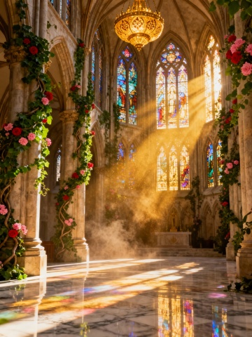 全景构图,拜占庭风格金色穹顶的内表面,融合螺旋状放射纹理与几何马赛克镶嵌工艺,浅香槟金到古铜金的渐变背景上,交错分布着细密的锤击凹痕与阿拉伯藤蔓纹样,右上方斜射的光线在凸起的葡萄藤装饰上形成钻石切割般的高光,凹陷处沉淀着红铜色阴影,表面悬浮着24K金箔碎屑与微型水晶棱镜,折射出星芒状光斑,穹顶中心垂落着由齿轮与鸢尾花交织而成的动态吊灯轮廓,整体呈现神圣与机械美学的共生感。