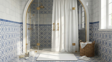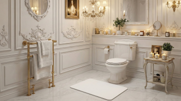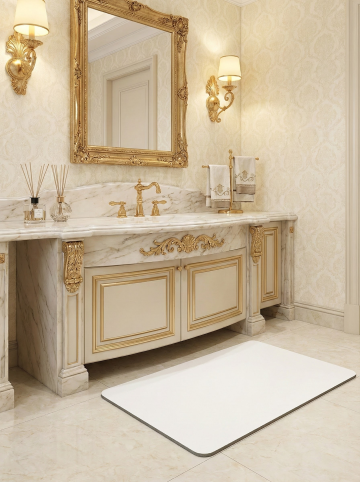 生成4张浴室地垫的场景 产品是图中白色地垫 浴室背景可以是欧式风格 法式风格的浴室 全景展示 地垫可以放在洗手台边 也可以是马桶边 或者是淋浴房门口