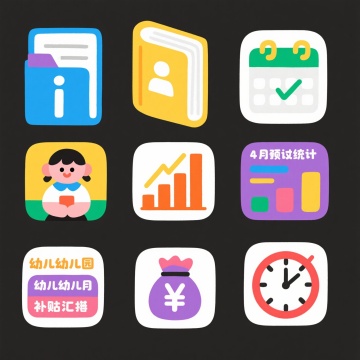 一套6个规整排布的卡通儿童系列插画,整体采用统一的明亮纯色背景(非原图像色彩),保持原图像的可爱Q版手绘风格,圆润的线条,柔和的渐变色彩,高光和阴影的细腻处理,以及简洁的构图。每个画面中都有一个穿着校服(白色上衣、蓝色领巾、不同颜色短裤/裙子)的亚洲儿童,动作各不相同:第一个孩子戴着黄色帽子正在专注地看书,第二个孩子坐在书桌前认真写作业,第三个孩子背着书包准备上学,第四个孩子张开双臂欢呼跳跃,第五个孩子正在欢快地跑步,第六个孩子抬脚用力踢着足球。每个孩子都有着大大的眼睛,灿烂的笑容,周围点缀着几片轻盈的叶子,整体氛围活泼、阳光、充满童真。所有元素排布整齐有序,形成一个和谐统一的系列素材集合。