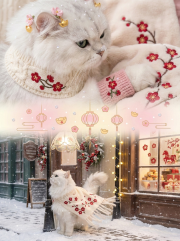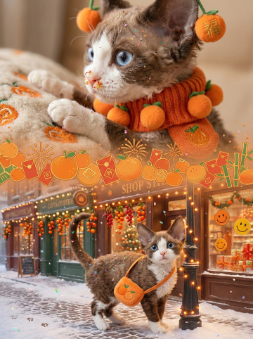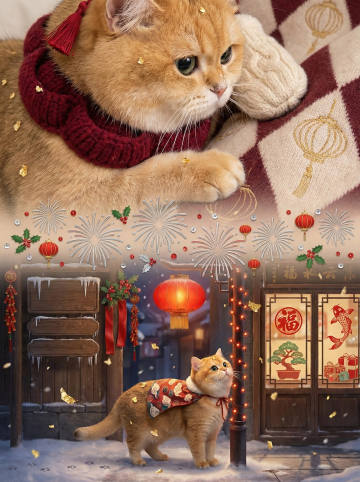大特写镜头,图中宠物侧脸特写,暖橙色针织如意领裹着脖颈,绒毛沾着细碎的彩色糖纸碎片,黑亮的鼻尖凝着小圆糖粒,爪子轻搭在缀有刺绣鞭炮图案的粗纺棉麻毯上,耳尖坠着迷你金色小铃铛,领边露出半截橘色针织小袜子。中间衔接元素大面积灯笼图标层叠交织,灯笼边缘鎏金描边,中间点缀迷你中国结与松枝图案,灯笼间隙飘着细碎的彩色亮片,将上下画面柔和衔接,营造出元旦街头的热闹氛围感。下宫格中景镜头,图中宠物站在现代商业街的霓虹路灯下,晃着尾巴蹭了蹭灯杆,背上的条纹小披风被夜风拂起,身后是闪着光的亚克力 “元旦特惠” 店铺招牌,招牌旁挂着气球串新年装饰,路灯杆上缠满彩色小彩灯,街边橱窗贴着数字 “202X” 与星星窗花,橱窗内摆着新年玩偶与礼盒,地面彩砖上散落着小爪印形状的脚印,大片彩色纸屑簌簌落在绒毛与商业街石板路上。