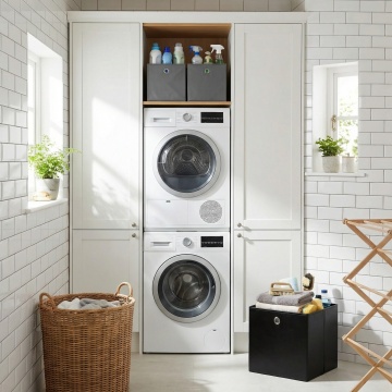超写实主义风格,主色调为纯净的白色、浅灰色与原木色,柔和自然光从侧上方洒入,形成细腻的高光与浅淡阴影,展现光滑的瓷砖地面反射质感、洗衣机的现代塑料与金属光泽、藤编篮的自然纹理。画面中央是白色滚筒洗衣机,正面圆形透明视窗,顶部放置着简约瓶罐,左侧地面有装满白色毛巾的圆形藤编篮,旁边是一株绿色植物。背景改为明亮的现代厨房,白色哑光橱柜与浅色大理石台面,右侧搭配原木色开放格置物架,整体构图保持对称平衡,营造洁净、有序、温馨的家居氛围,视觉层次分明,信息传达简洁高效,符合现代家居产品展示的设计感。