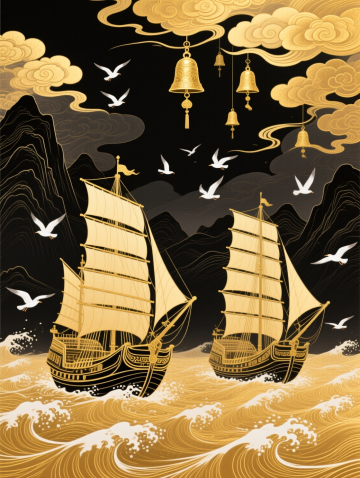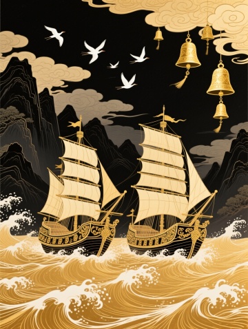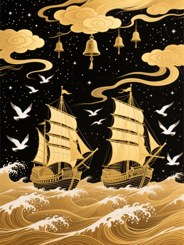 整体红金色调,热闹氛围。画面含金黄圆月,一只唐代小船(船身绘云纹,满载节日物资,唐代船工挥汗)和一艘现代豪华邮轮(甲板有中秋赏月人群、邮轮灯光璀璨),一道洒金的浪花阻隔在中间,背景是同一片金色的海,水面波光映照着月光与邮轮霓虹,祥龙飞过天际。整体画面充斥着华丽的金色和喜庆的红色,奇幻色彩和光影变化,具有丰富的层次感和立体感,体现繁荣昌盛喜庆氛围,梦幻的大透视
