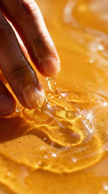 微距俯拍,金黄至琥珀色的特级初榨橄榄油在深色胡桃木容器中形成完美的曲面,表面张力使油面呈现出丝绸般细腻的波浪状纹理,数十个大小不一的晶莹气泡悬浮其中——有的如珍珠般单独静卧,有的则聚集成精致的泡沫星系,液体边缘泛着如同融化黄金般的高光。柔和的浅灰色渐变背景上,一束45度角的聚光从上方斜射而下,在油面形成星芒状反光点,气泡表面折射出彩虹般的微小光谱,底部则投下层次分明的柔和阴影。橄榄油特有的温润光泽与气泡的透明质感形成鲜明对比,整体画面呈现出液体黄金的纯净与生命力,每一滴油的流动轨迹都被清晰捕捉,细节极致入微。