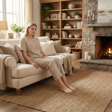 现代极简风格的客厅场景,以浅灰色调为主的现代家具布置,画面聚焦于铺在浅灰色瓷砖地面上的浅灰色条纹地毯特写,地毯表面有细腻的竖条纹纹理和柔软的编织质感,占据画面下方大部分区域;背景中可见浅灰色布艺沙发,搭配几个同色系的靠垫,沙发旁有一个圆形金属边框的小茶几,靠墙处有一个简约的灰色搁板,上面放置一个小型装饰画框;右侧是大面积的落地窗,透过轻薄的白色纱帘洒入明亮柔和的自然光,光线在地毯和地面上形成自然的光影过渡,窗外可见模糊的绿色植物,整体营造出宁静、整洁、高级的现代家居氛围,空间感开阔,线条简洁,色彩统一和谐,具有清晰的视觉层次和舒适的居住感。